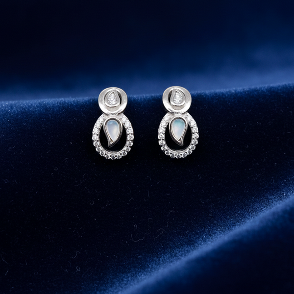 Orbit Studs (Silver): Elegant 92.5 pure silver earrings featuring a minimalist yet striking design with interlocking circles adorned with sparkling cubic zirconia stones.
