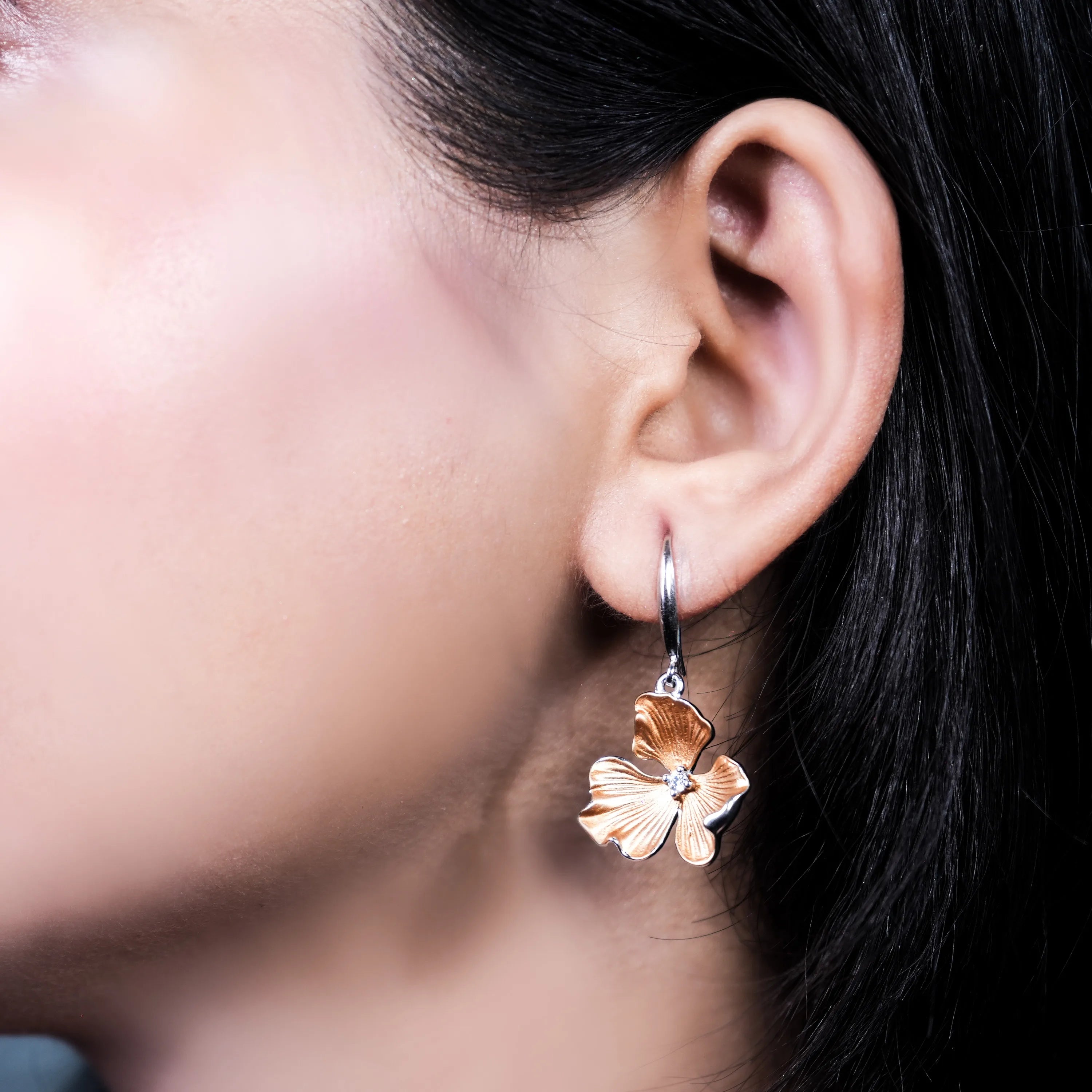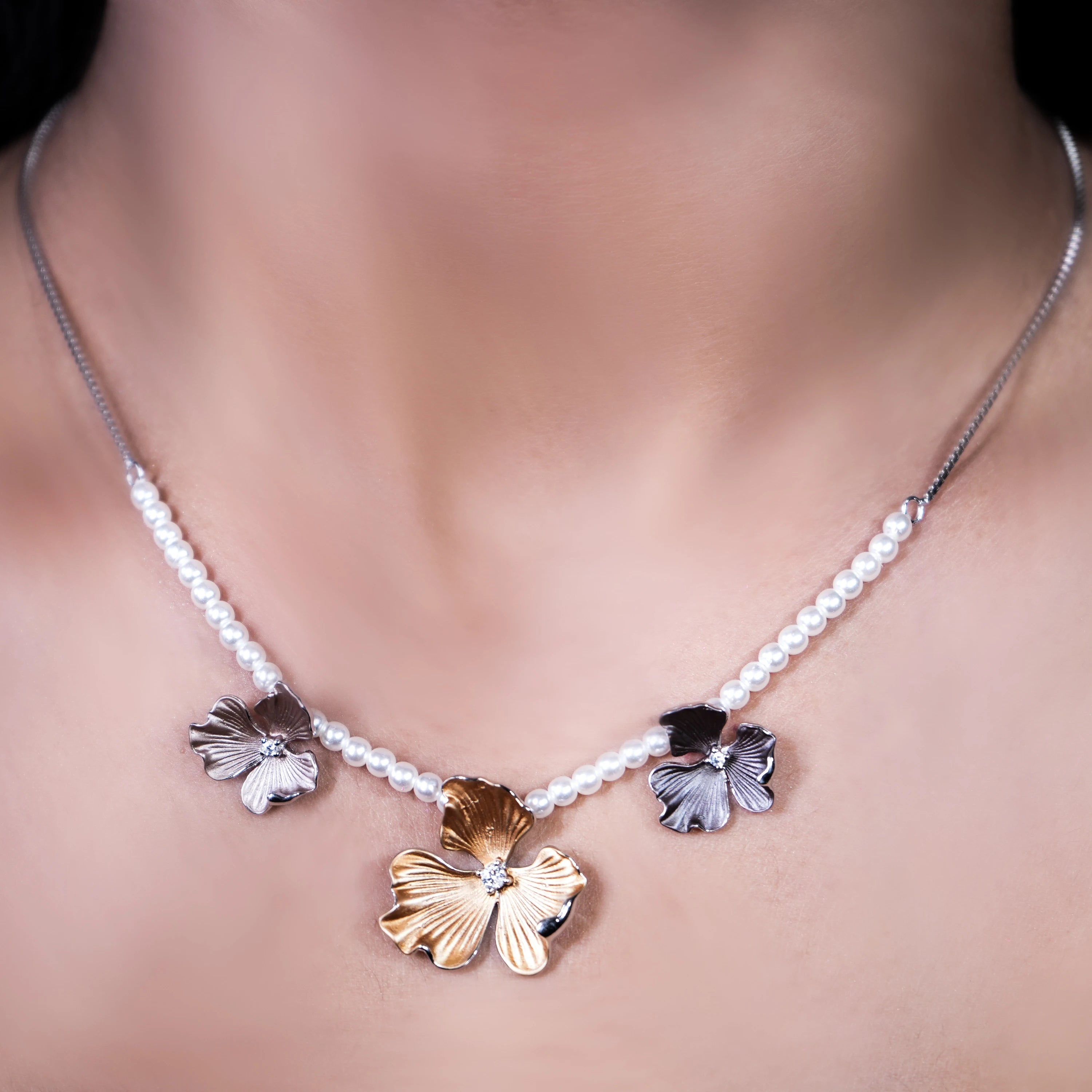 This enchanting 925 sterling silver necklace features a delicate chain adorned with lustrous white pearls. Three captivating orchid-inspired charms, in silver, black, and gold tones, dangle gracefully from the pearls, creating a harmonious blend of nature and elegance. With a 16-inch length and a 2-inch extension, this necklace, complete with matching earrings, offers a refined and unique statement.