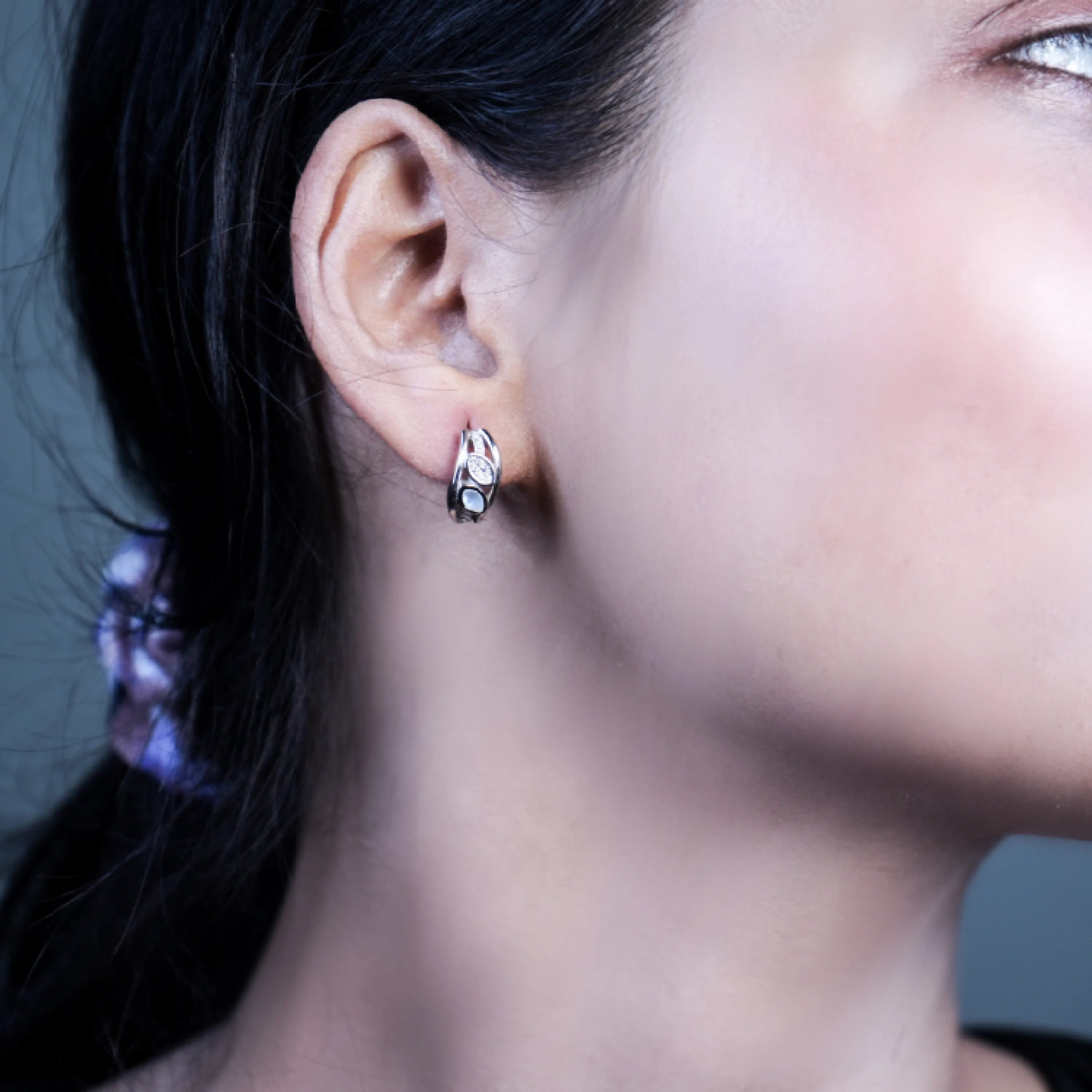 These contemporary 925 sterling silver huggie earrings feature a unique, multi-stone design that elegantly curves to hug the earlobe. The combination of varied shapes and the subtle sparkle from the stones offers a modern and sophisticated aesthetic. Perfect for daily wear, they add a touch of refined glamour and visual interest to any look.