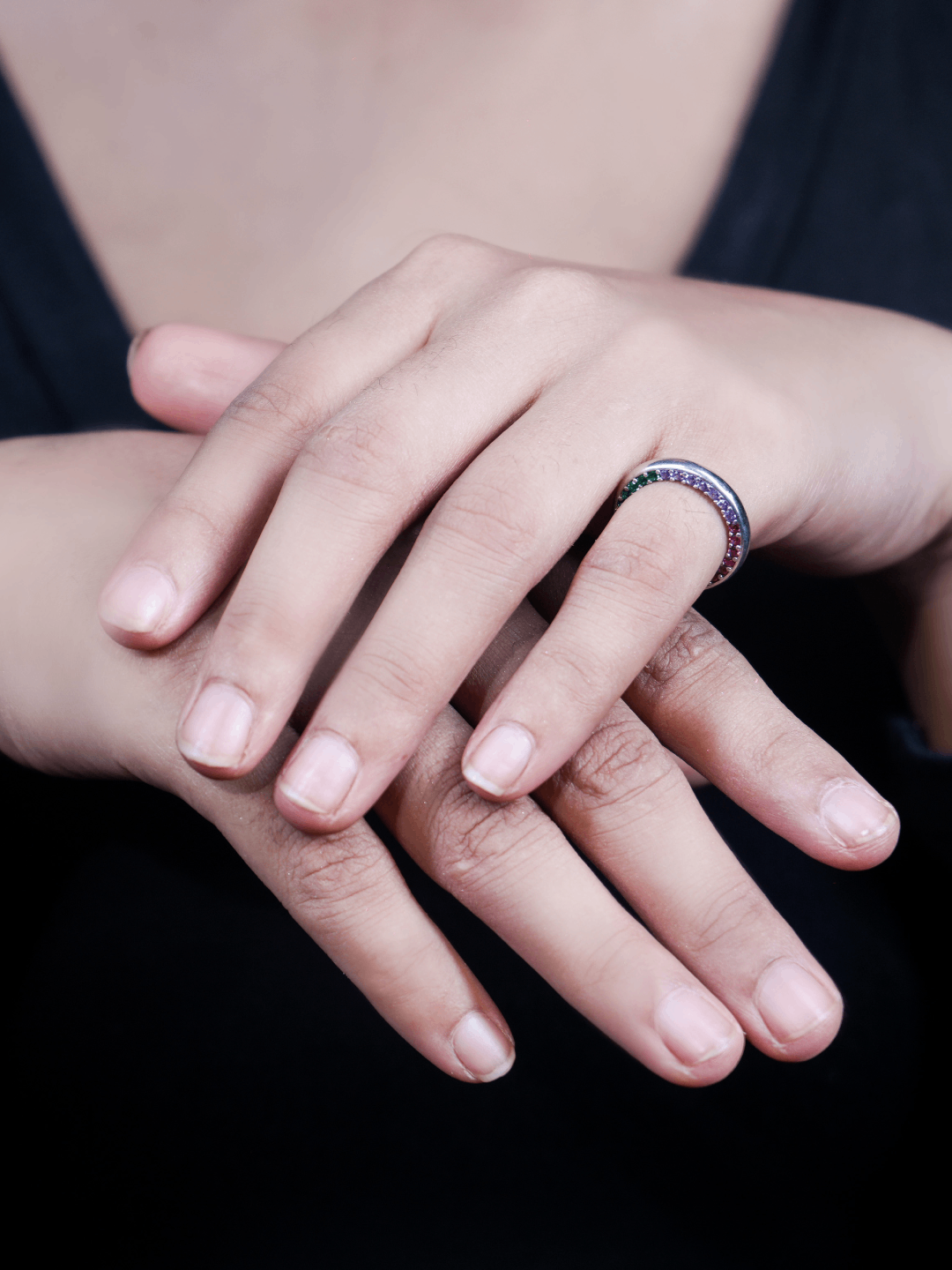 Add a kaleidoscope of color to your style with this delightful 925 sterling silver eternity ring. Adorned with a continuous circle of brilliantly hued cubic zirconia in a vibrant rainbow spectrum, it offers a cheerful sparkle. Perfect for stacking with other rings or wearing solo as a delicate statement, this joyful piece brings a playful yet elegant touch to any daily ensemble.