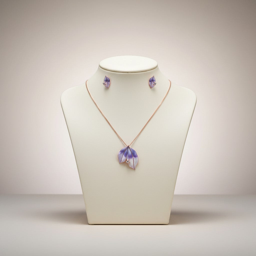 This striking 925 sterling silver pendant set features a beautifully textured leaf-shaped pendant, showcasing intricate veining and a captivating blend of silver and lavender hues. The accompanying stud earrings perfectly echo the organic motif. With a versatile 16-inch chain and a 2-inch extension, this set offers a unique and nature-inspired elegance, perfect for adding a sophisticated touch to any outfit.